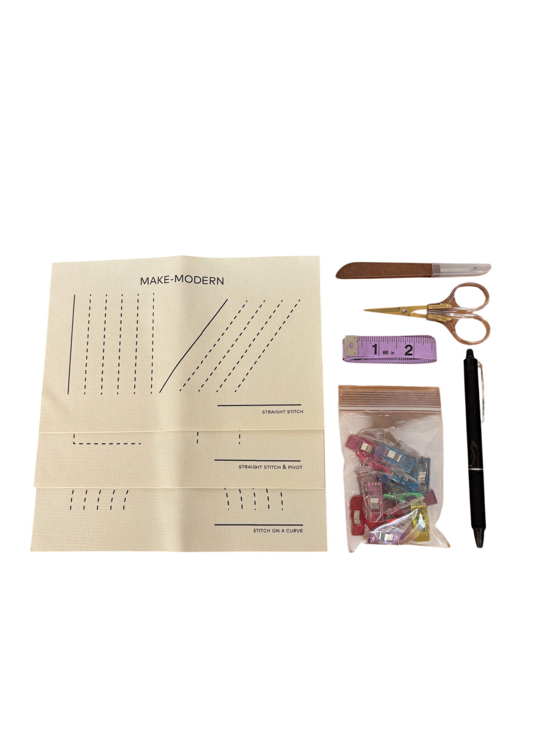 Packed with mixed essentials like a measuring tape, seam ripper, 25 Wonder Clips, machine stitch cards, mini scissors, and a fabric pen - it contains all the basic essentials you need to start stitching on your machine.